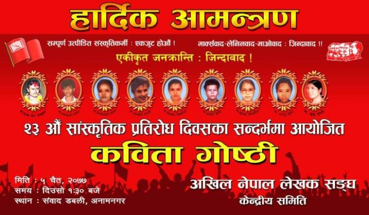 चैत ४, बुटवल । नेपाल कम्युनिस्ट पार्टी निकट अखिल नेपाल जनसांस्कृतिक महासंघको आंगिक संगठन अखिल नेपाल लेखक संघको केन्द्रीय समितिले २३ औँ सांस्कृतिक प्रतिरोध दिवसको सन्दर्भमा चैत ५ गते काठमाडौँमा कविता गोष्ठी आयोेजना गरिएको आयोजकले बताएको छ ।