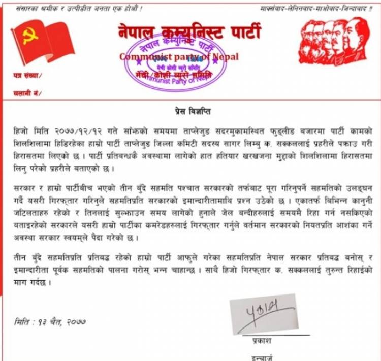 व्युरो इन्चार्ज प्रकाशले शुक्रबार प्रेस विज्ञप्ति निकाली बिहीबार साँझ ताप्लेजुङ सदरमुकामस्थित फुङ्लीङ बजारमा पार्टी कामको शिलशिलामा हिडिरहेका सागर लिम्बु (सक्कल) लाई गिरफ्तार गर्नुले वर्तमान सरकारको नियतप्रति आशंका गर्ने अवस्था स्वयम् सरकारले पैदा गरेको भन्दै तत्काल रिहाईको माग गरेका छन् । व्युरो इन्चार्ज प्रकाशले विज्ञप्तिमा भनेका छन्,