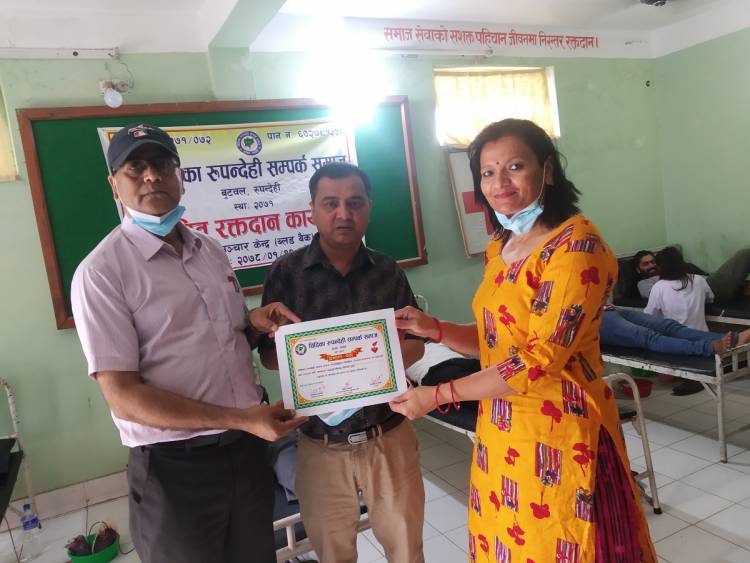 तिलोत्तमा । अर्घाखाँचीको चिदिकाबाट रुपन्देही आइ बसोबास गर्नेहरुको संस्था चिदिका–रुपन्देही सम्पर्क समाजले शनिबार रक्तदान कार्यक्रम सम्पन्न गरेको छ । समाजका अध्यक्ष केशवराज पन्थीको अध्यक्षतामा भएको रक्तदान कार्यक्रमको उद्घाटन लुम्बिनी प्रदेश लेखा नियन्त्रण कार्यालयका प्रमुख दिपक ज्ञवालीले गरेका थिए ।