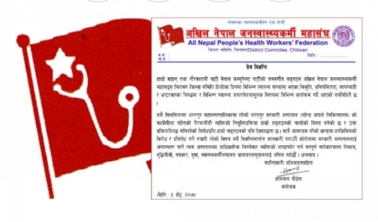 चितवन । अखिल नेपाल जनस्वास्थ्यकर्मी महासङ्घ चितवनले प्रेस विज्ञप्ति जारी गरी भरतपुर महानगरपालिकामा रहेको भरतपुर सरकारी अस्पताल (महेन्द्र आदर्श चिकित्सालय) को फार्मेसीमा गरिएको गैरफार्मेसी व्यक्तिको नियुक्ति बदर गर्न माग गरेको छ ।