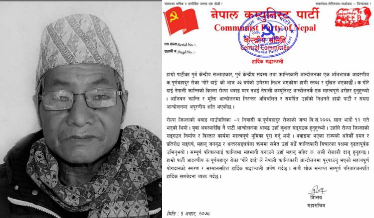 मङ्गलबार ७३ वर्षको उमेरमा निधन भएका ‘गोरे दाई’प्रति श्रद्धाञ्जली वक्तव्य जारी गर्दै महासचिव विप्लवले क्रान्तिकारी आन्दोलनका एक अभिभावक पूर्णबहादुर रोका ‘गोरे दाई’ को निधनले आफू स्तब्ध र दःखी भएको बताएका छन् । गोरे दाई नेपाली क्रान्तिको किल्ला रोल्पा थवाङ मात्र नभई नेपाली कम्युनिस्ट आन्दोलनकै एक महत्वपूर्ण धरोहर भएको भन्दै विप्लवले आजिवन क्रान्ति र मुक्ति आन्दोलनमा निरन्तर अविचलित व्यक्तिको निधनले आफ्नो पार्टी र समग्र आन्दोलनमा अपुरणीय क्षति भएको उल्लेख गरेका छन् ।