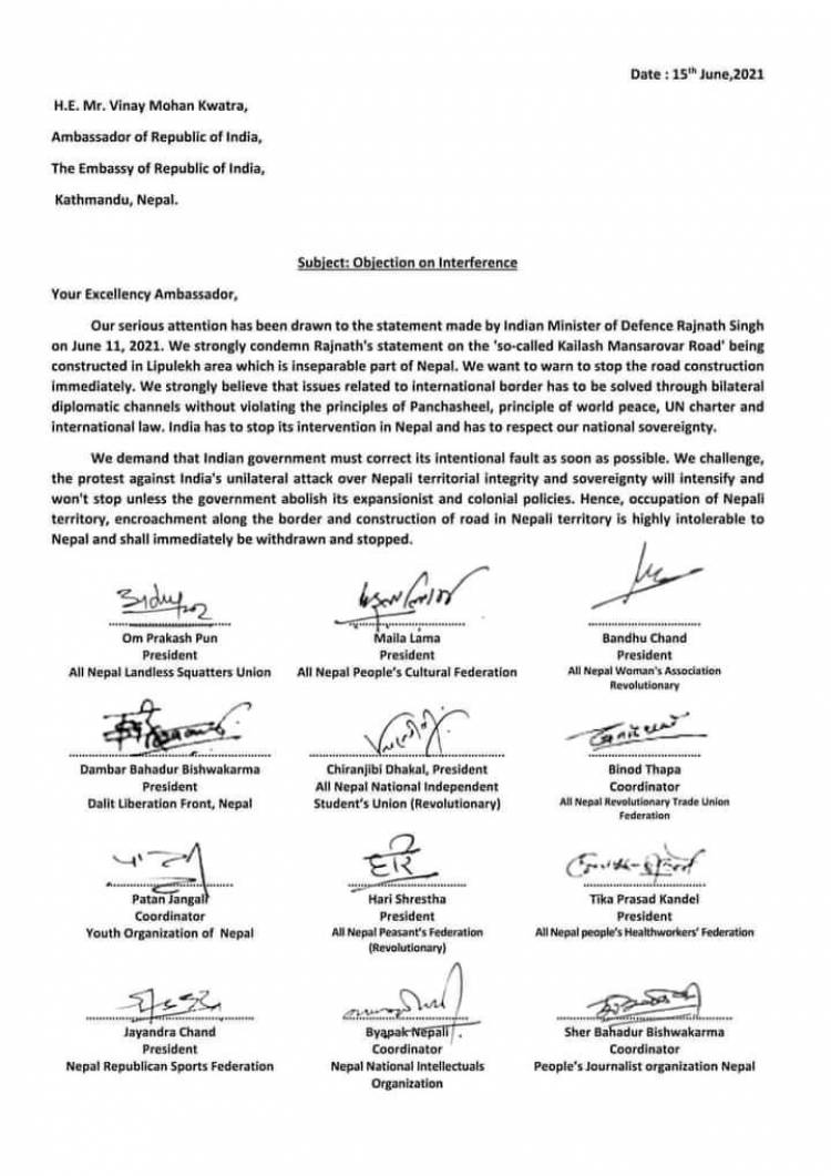 ज्ञापनपत्रमा भनिएको छ, ‘भारतले नेपालमा आफ्नो हस्तक्षेप रोक्नु पर्दछ र हाम्रो राष्ट्रिय सार्वभौमिकताको सम्मान गर्नुपर्दछ । हामी माग गर्दछौँ कि भारत सरकारले जानाजानी यस गल्तीलाई जतिसक्दो चाँडो सुधार गर्नुपर्दछ । हामी चुनौती दिन्छौँ, नेपाली क्षेत्रीय अखण्डता र सार्वभौमिकतामाथि भारतको एकपक्षीय आक्रमणको विरोध तीव्र हुनेछ र सरकारले आफ्नो विस्तारवादी र औपनिवेशिक नीतिहरू समाप्त नगरेसम्म रोक्नेछ । तसर्थ नेपाली क्षेत्रको कब्जा, सीमा क्षेत्रमा अतिक्रमण र नेपाली क्षेत्रको सडक निर्माण असहनीय छ ।’