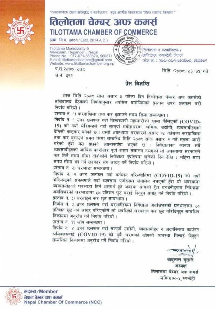 बैठकपछि संस्थाका अध्यक्ष बाबुलाल भुसालद्वारा जारी विज्ञप्तीमा कोभिड–१९ को नयाँ भेरियन्टको संक्रमणले गर्दा व्यवसाय पूर्णरुपमा सञ्चालन नभएको उल्लेख गर्दै ५० प्रतिशत घरभाडा छुट गर्न पनि घरधनीहरुलाई आग्रह गरिएको छ ।