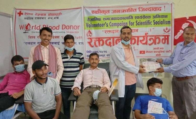 कोरोना महामारीले पछिल्लो समय जिल्लामा भएको रगतको चरम अभावलाई मध्यनगर गर्दै ‘वैज्ञानिक समाजवादका लागी स्वयंसेवक अभियान’ अन्तर्गत रक्तदान कार्यक्रमको आयोजना गरिएको नेकपा बाँकेले जनाएको छ ।