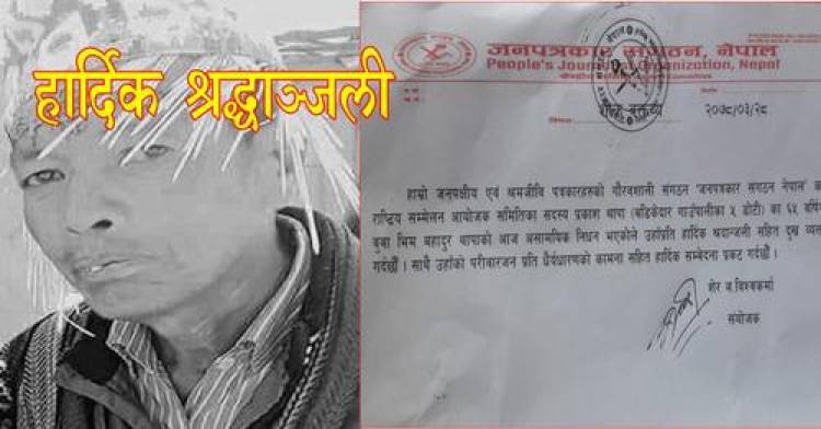 जनपत्रकार सङ्गठन नेपालका संयोजक शेरबहादुर विश्वकर्माले सोमबार शोक वक्तव्यमार्फत् बडिकेदार गाउँपालिका ५ डोटीका ६५ वर्षिय बुबा भिमबहादुर थापाको असामयिक निधनप्रति हार्दिक श्रद्धाञ्जलीसहित दुःख व्यक्त गरेका छन् । साथै शोकाकुल परिवारजनप्रति हार्दिक समवेदना प्रकट गरेका छन् ।
