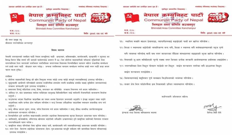 गणेश एसके । कञ्चनपुर । नेकपा कञ्चनपुर भिमदत्त नगर कमिटिले नेपाली जनताको दैनिक जनजीवनमा स्थानीय सरकारलाई जिम्मेवार र इमान्दार बन्न माग गर्दै शुक्रबार १६ बुँदे माग पत्र बुझाएको छ ।